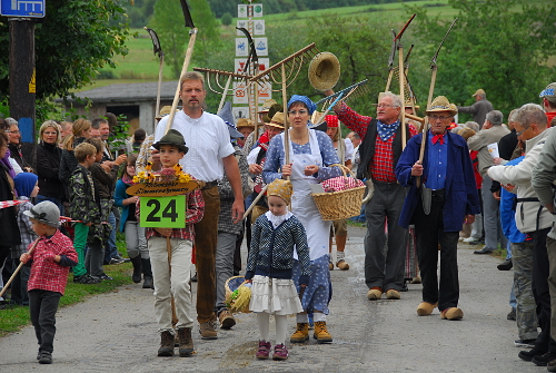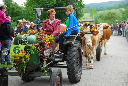 Um 14.00 Uhr treffen die ersten Tiere von der Ganzjahresweide im Dorf ein. Sie werden angeführt vom Musikverein und dem Ortsdiener. Die geschmückten Kühe und die Herde werden von den Bauern durch das Dorf zu ihren Ställen geführt. Die Herde wird begleitet von Motivwagen und Laufgruppen die auf dörfliche und kleinbäuerliche Tradition der 50er und 60er Jahre hinweisen. Das Festprogramm endet in den Abendstunden mit Feierlichkeiten in den Dorfscheunen rund um den Dorfplatz.